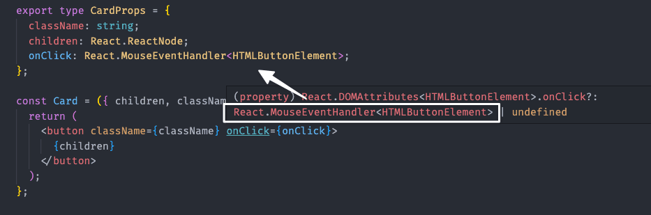 We have a click event and If we hover over it we'll se a menu displaying the type, we can take it and insert in the definition of the props.